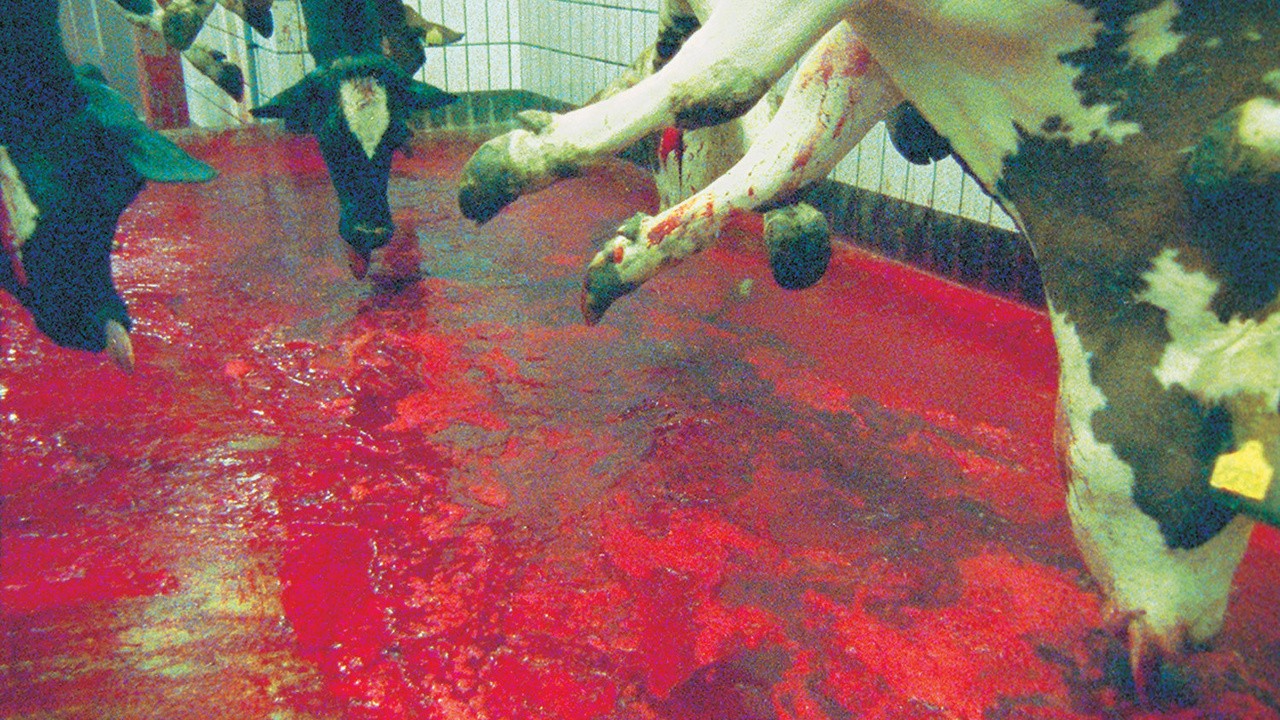 Best in Beef juxtaposes surreal visions of hell in a slaughterhouse against abattoir workers eating at lunchtime. Images of blood-splattered faces between mouthfuls sit uneasily alongside the upstairs executive in suits, methodically eating while doing business on the phone.