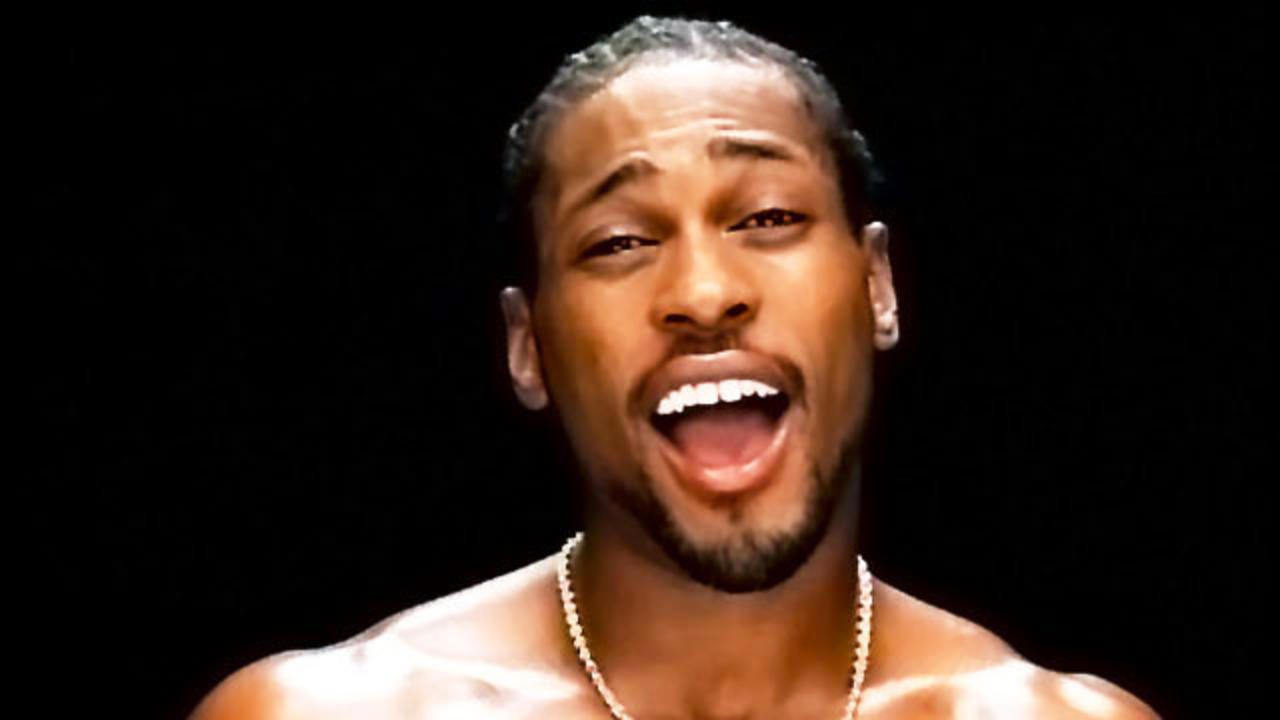 The video features a chiseled and muscular D’Angelo, wearing a small gold-chained crucifix necklace, lip-synching while filmed on a platform from the waist-up and appearing nude.