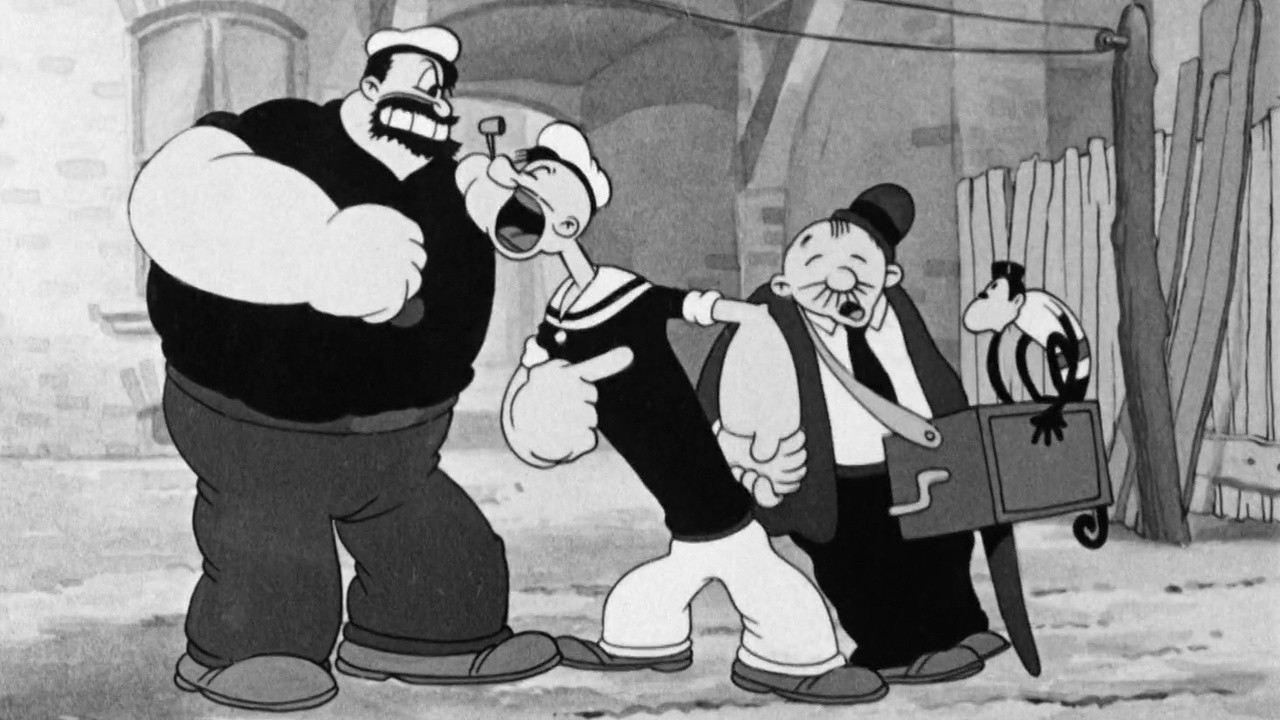 Popeye and Olive are grooving to the sounds of Wimpy the organ grinder, but their neighbor Bluto wants him to move on.
