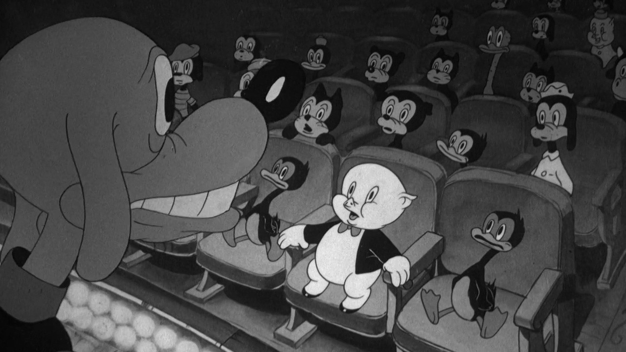 Porky Pig is on his way to the store to pick up some groceries for his mother when he walks by a sign saying that the local movie theater is having a “kids admitted free” day.