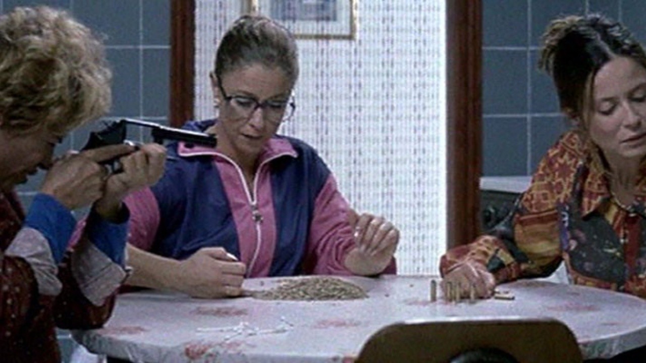 Five housewives drink coffee together in a kitchen. They talk about supermarket special offers while playing Russian roulette.