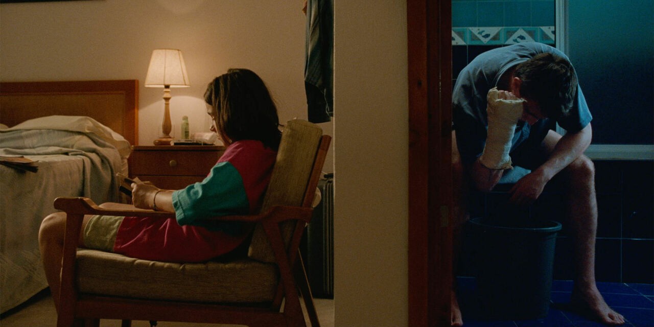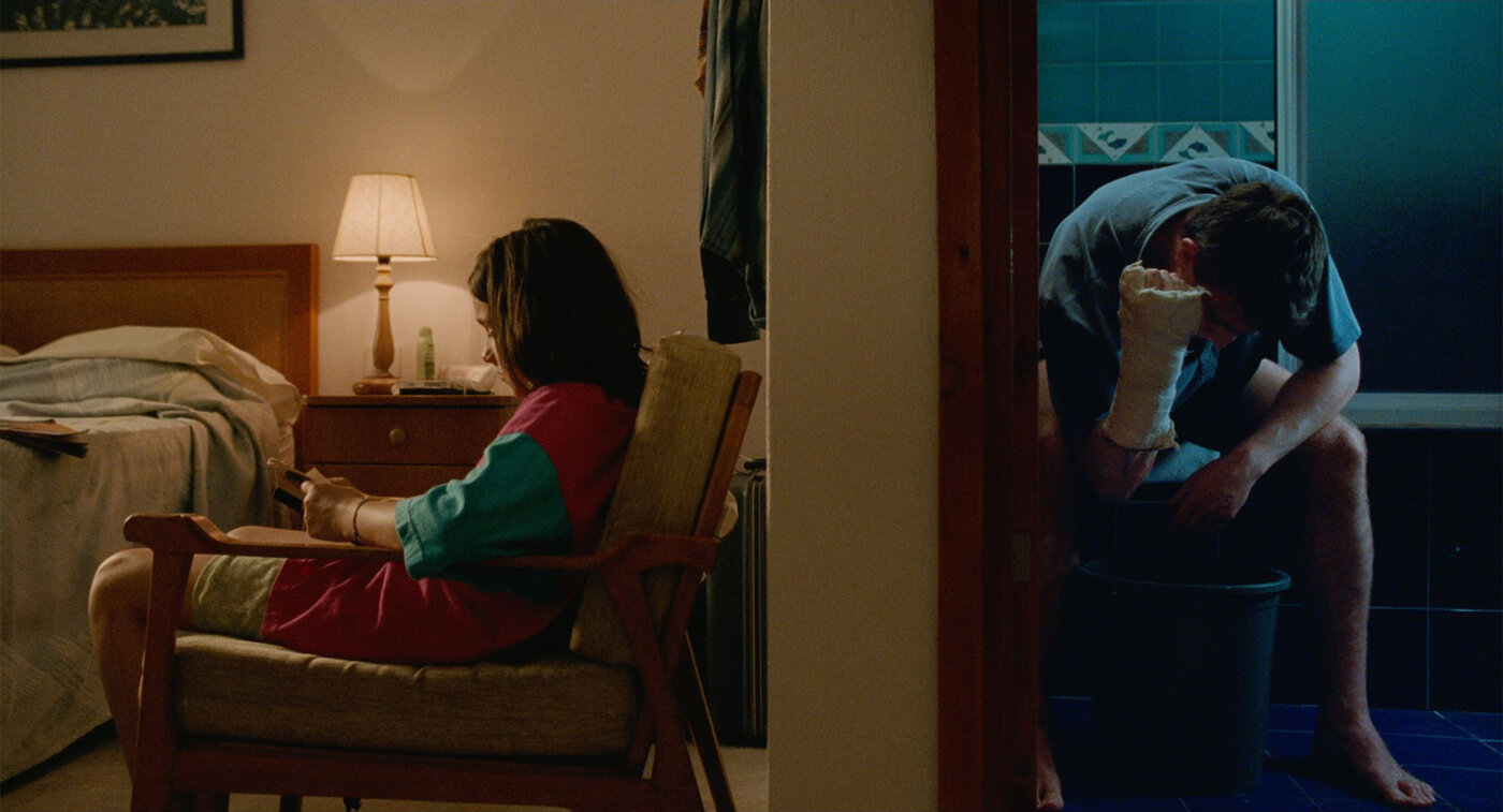 The border tile lines the background in one of my favorite shots from Aftersun: Sophie and Calum are in their shared hotel room, separated by the bathroom wall. They are having a conversation, yet each is also in their own internal world—a separation reinforced through color, design, and lighting.