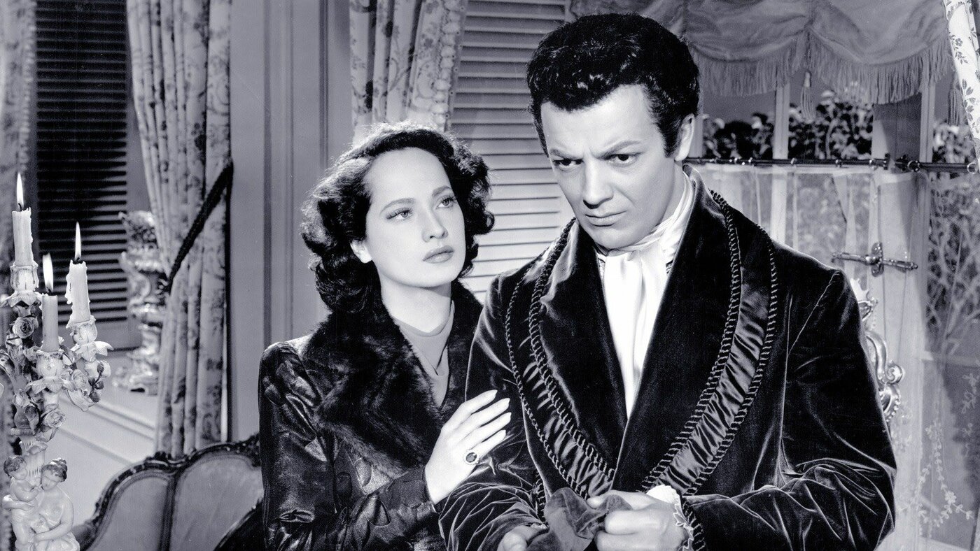In Wuthering Heights (1939), Oberon plays Catherine Earnshaw, whose contentious relationship with her brutish brother has, since childhood, drawn her closer to Heathcliff (Olivier), a dusky orphan raised alongside them in the titular family home. After trespassing on the estate of Edgar Linton (David Niven, a passionate love of Oberon, whom she never married), and being attacked by his dogs, Catherine stays the weekend to recover in his care and becomes smitten. She returns to Wuthering Heights looking like a new woman: clean, lily-white, upper middle class, in a frilly hat and a long, flowing silk dress that so starkly contrasts the plain clothes she previously wore. When Heathcliff questions her appearance she becomes defensive, and the memory of his candid reproach and her abrupt dismissal comes to haunt her. When Edgar, now her husband-to-be, proceeds to criticize Heathcliff in his absence, she resists him. “Some of that gypsy’s evil soul has got into you,” he admonishes. “Yes, it’s true,” she cries, clasping her hands underneath her fur muff, prompting him to exit.