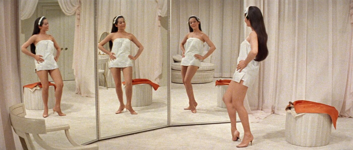It is within that very discordance between opposing selves—between the pull of impulse and the push of conscience, between the character’s intentions and the performer’s execution—that Kwan’s performances come alive. Her onscreen magnetism lies in this consequential resistance, mirroring her plight as a racialized performer under studio control. In the performances of Nancy Kwan, there is always another narrative operating behind the facade, this double life, this other voice that speaks from a darkened interiority. But, like Marjorie, just when things get interesting, Kwan is forced to withdraw. Toward the end of The Wild Affair, after the year-end office party has become a Dionysian playground, Marjorie, incensed, returns to the mirror one last time to confront Sandra. Rather than cheat on her fiancé with one of the several men who have thrust themselves upon her throughout the day, Marjorie adheres to the virtues reiterated by her mother, choosing fidelity, sanctity, purity. “I’m not with you,” Sandra says, chastising her other half. “Good,” Marjorie says: “Because you’re just not going to be with me anymore.” She turns the lights off, and Sandra falls into silhouette. Moments later, the mirror shatters into pieces that won’t be picked up.