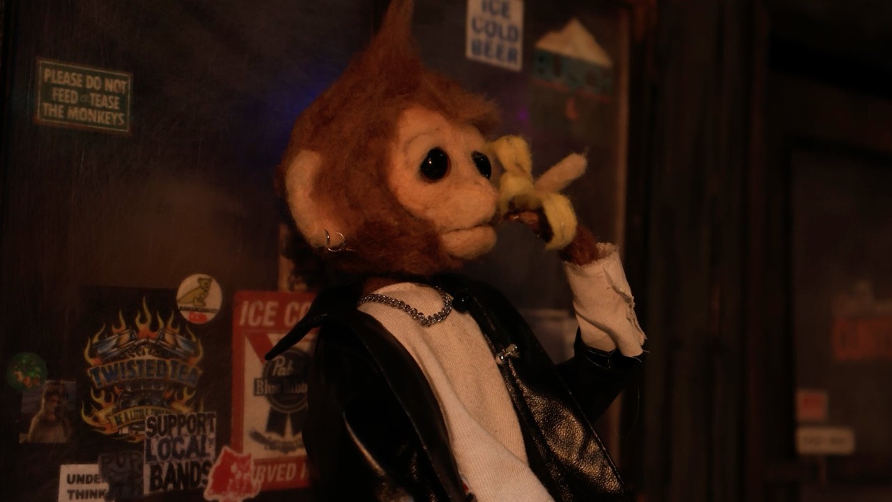 A sad monkey stands outside a bar grappling with their harsh reality by having a smoke.
