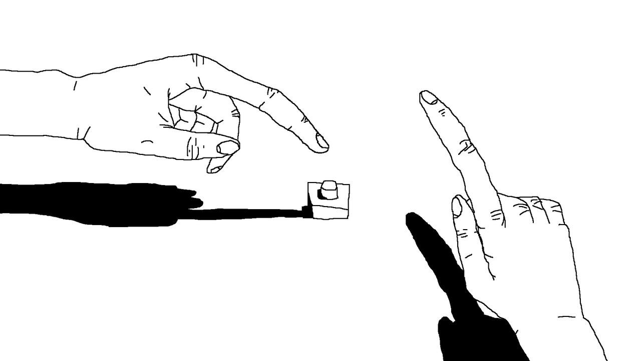 Anthropoid creatures with plugs in place of heads are up to mischief. Instead of abandoning oneself to the dictates of the raised finger, they soon submit to themselves. But the fingers also finger around. Is it love?