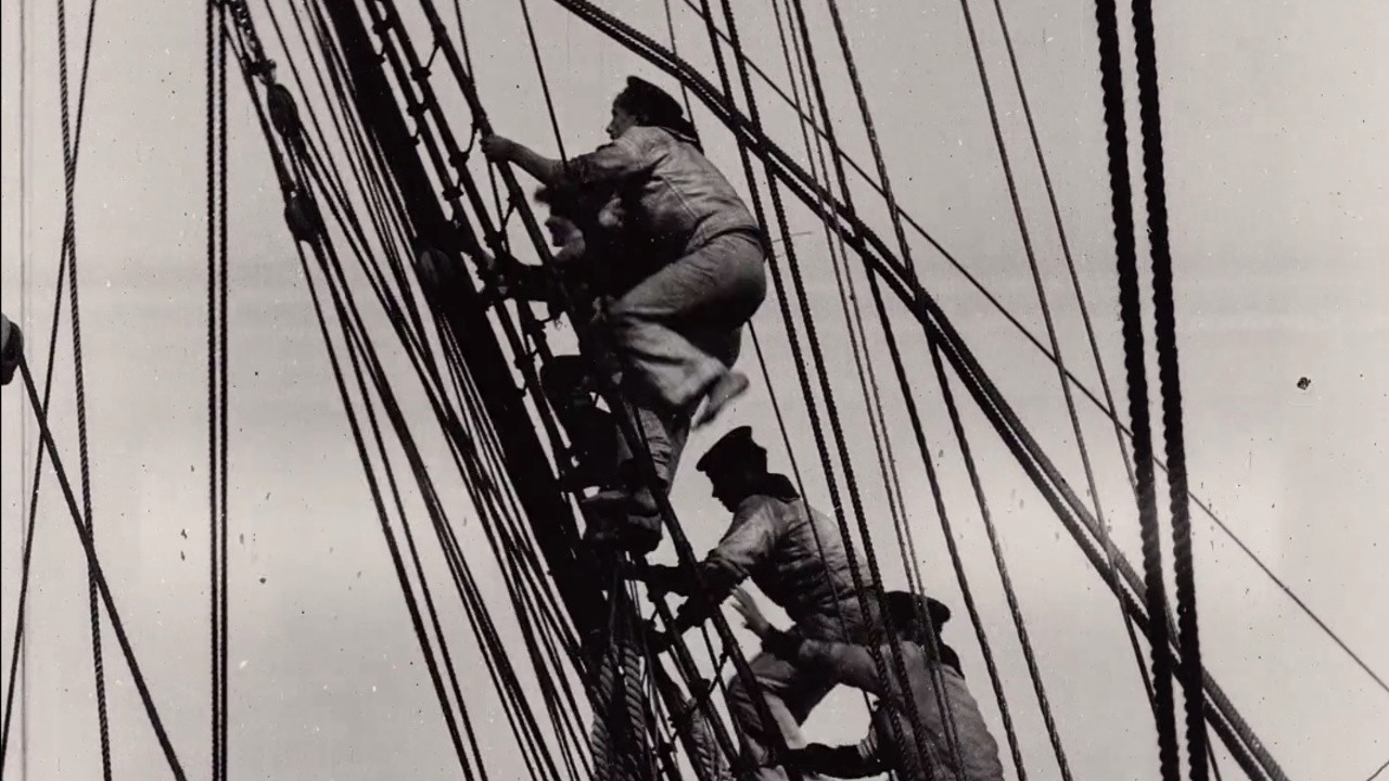 Taken aboard the H.M.S. ‘Seaflower.’ The men of the crew are seen scrambling up the shrouds on an order to furl sail.