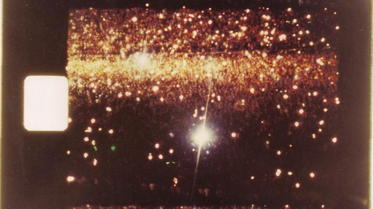 Many wide-angle long-shots, from high in the stands, of the dense crowds at different large rock concerts in Toronto’s Canadian National Exhibition Stadium.