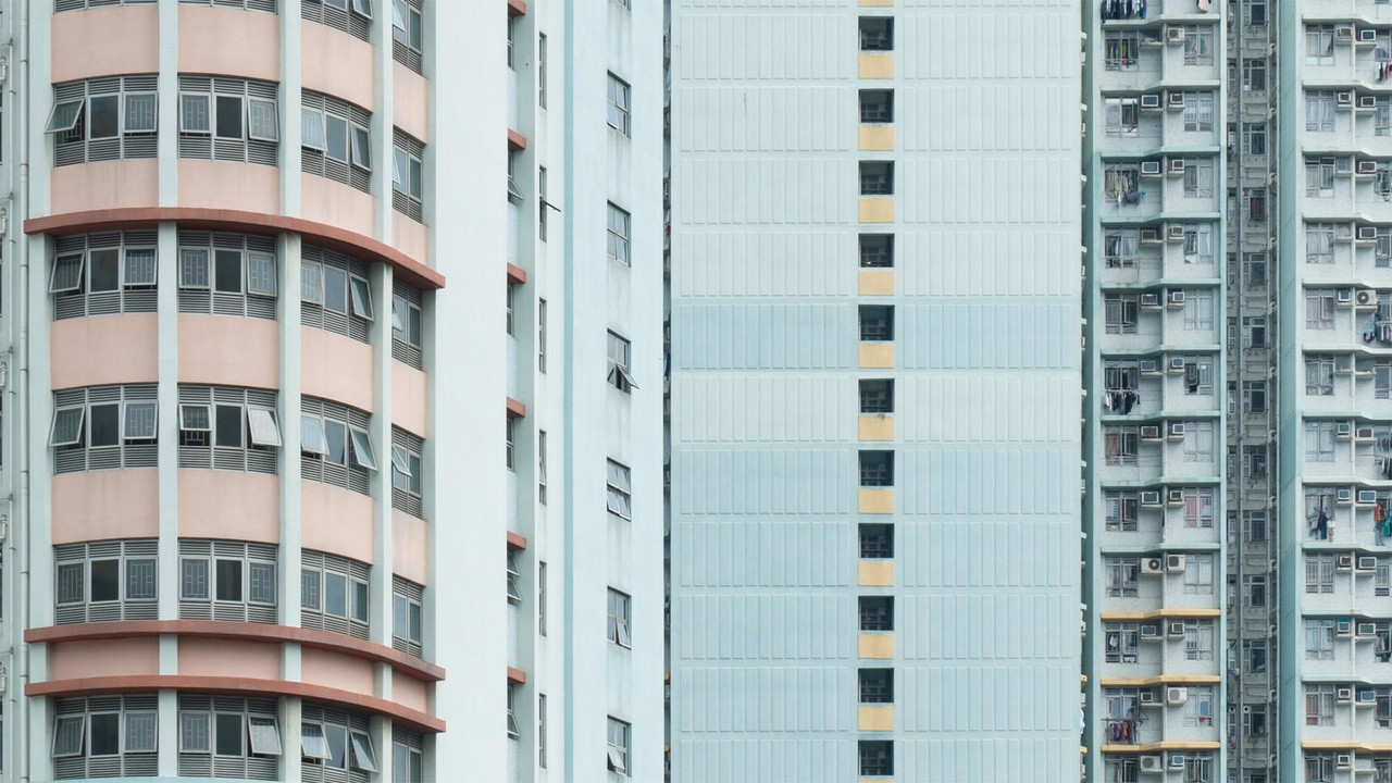 Hong Kong’s distinctively shaped housing blocks form mesmerizing patterns that appear to move in this dazzling, subliminally subversive dance of images.