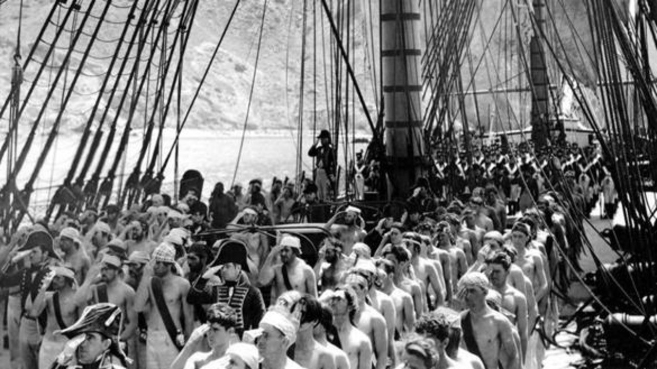 An American fighting ship battles Barbary pirates in the Mediterranean in the 18th century.