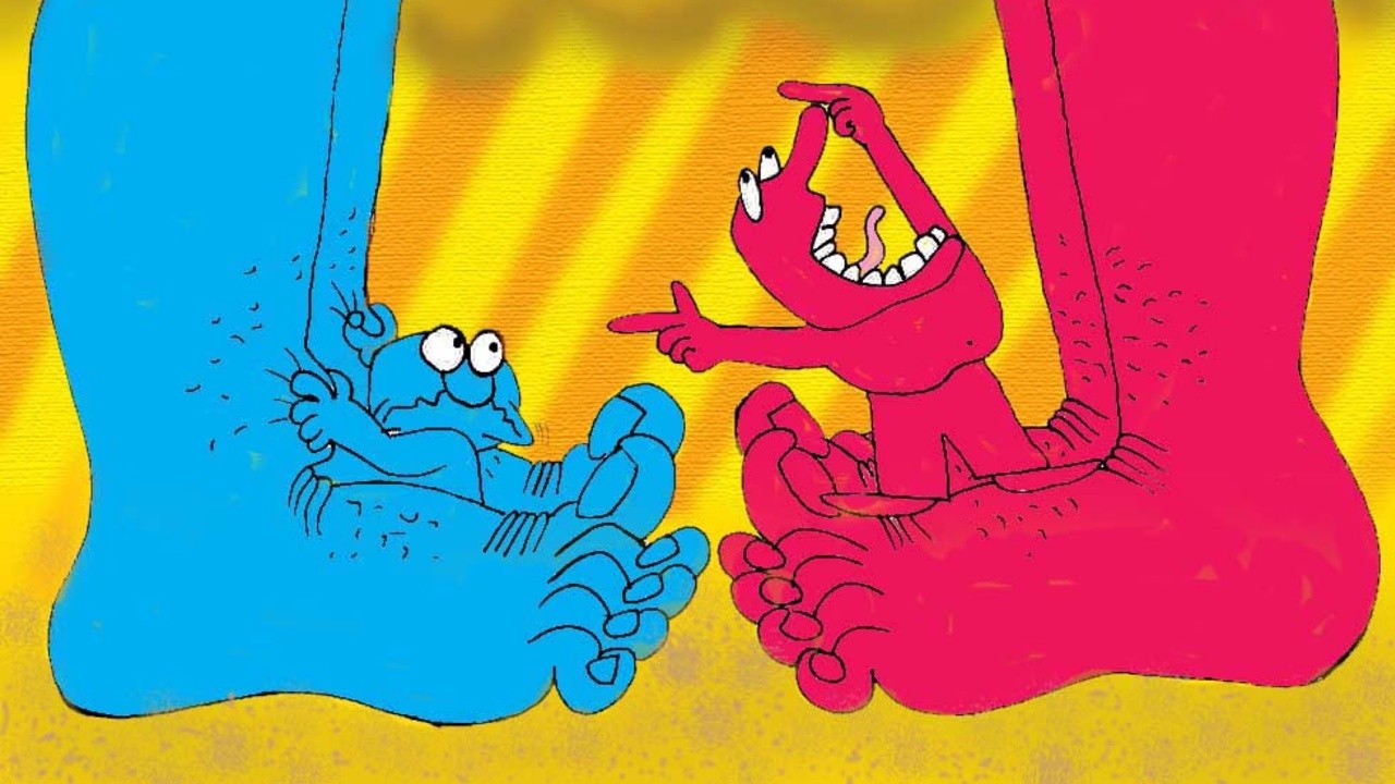 Two dwarfs – one bright blue and the other bright red – get into a fight, and each calls in a similarly colored giant to fight their battle.