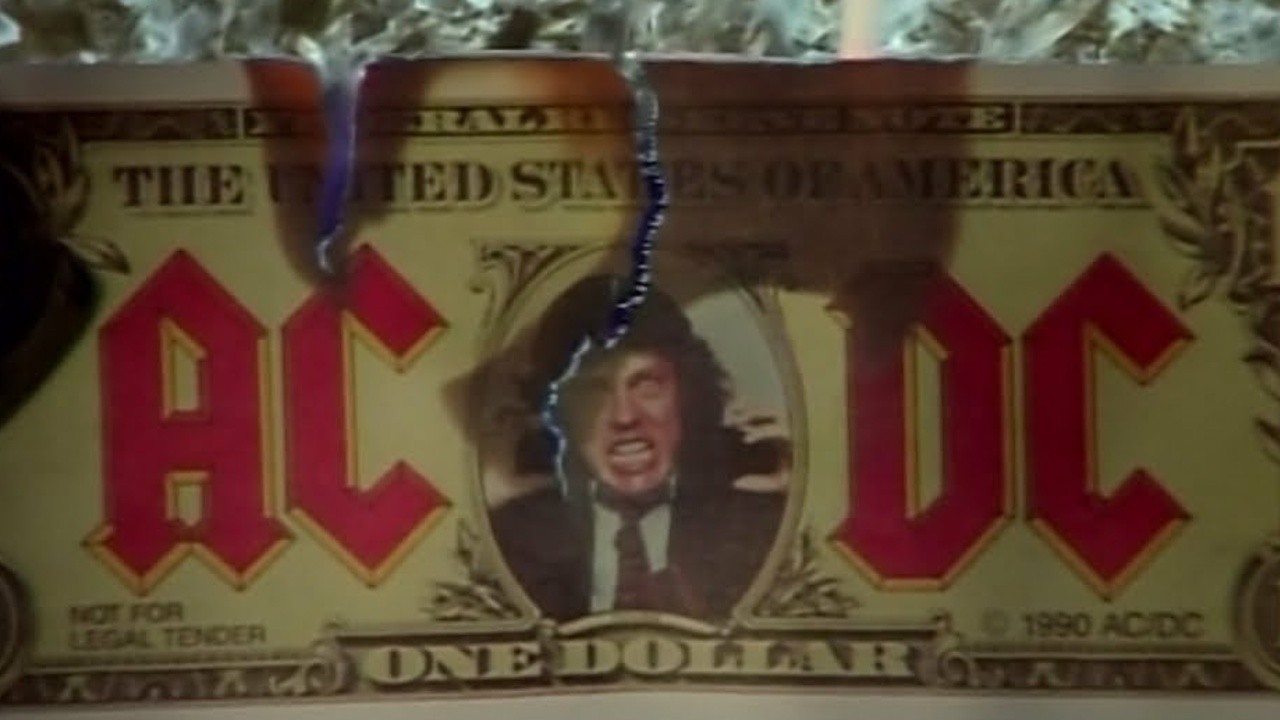 The video begins with a one dollar bill featuring the likeness of Angus Young burning. The band plays on a concert stage for an enthusiastic crowd. At the end, money falls on the crowd from the auditorium roof.