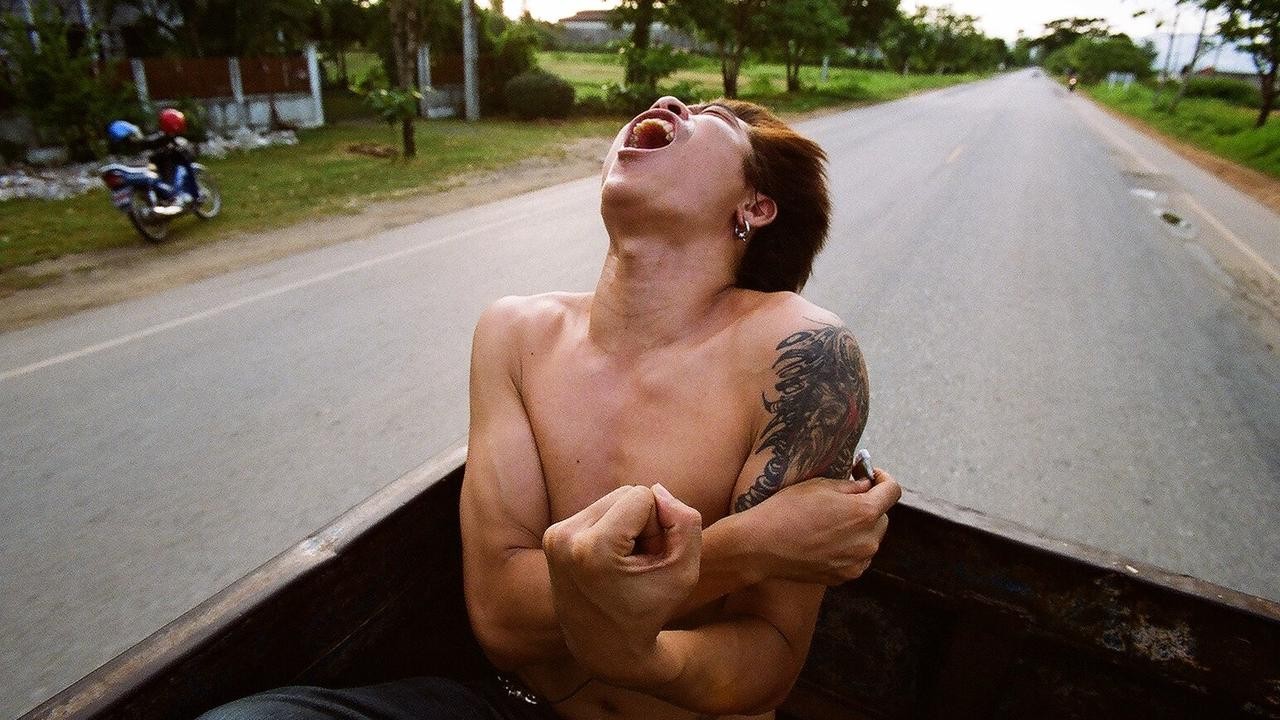 Features the filmmaker operating the camera himself, riding in the back of a pickup truck as it speeds down the highway with two other men.