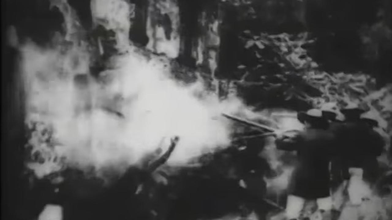 A file of Spanish soldiers line up the Cubans against a blank wall and fire a volley. The flash of rifles and drifting smoke make a very striking picture.