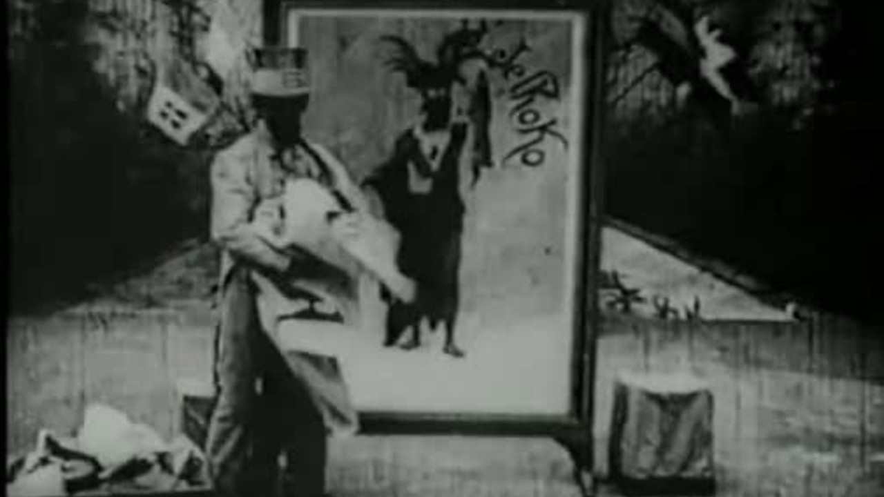 A magician and some assistants put up a series of posters of music hall acts in a frame. Then the magician brings each poster to life. – Produced by Pathé Frères.