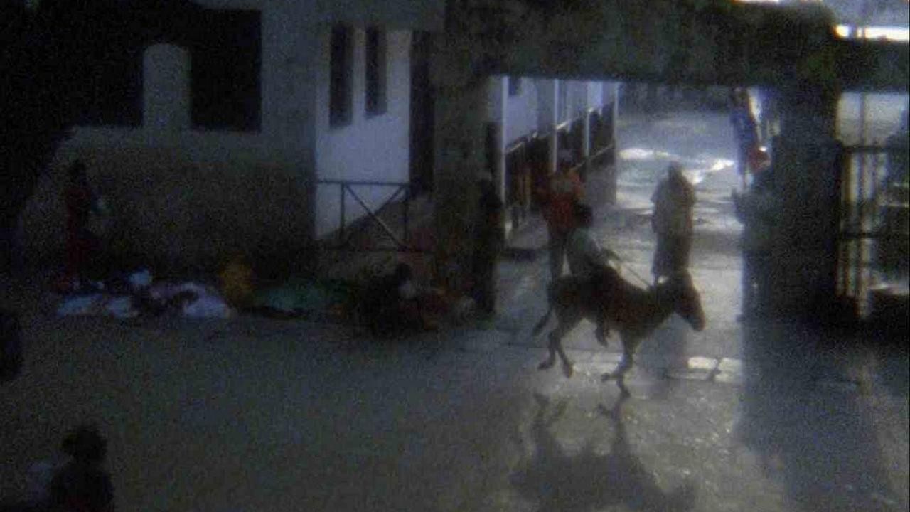 A man rides a donkey across a town square in Kenya, seen from a high, distant vantage point.