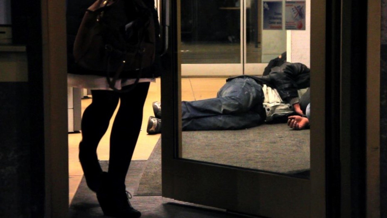 Some homeless men lay sleeping on the floor of a bank vestibule. If you want to use the ATM, you’ll have to step right over them or find somewhere else.